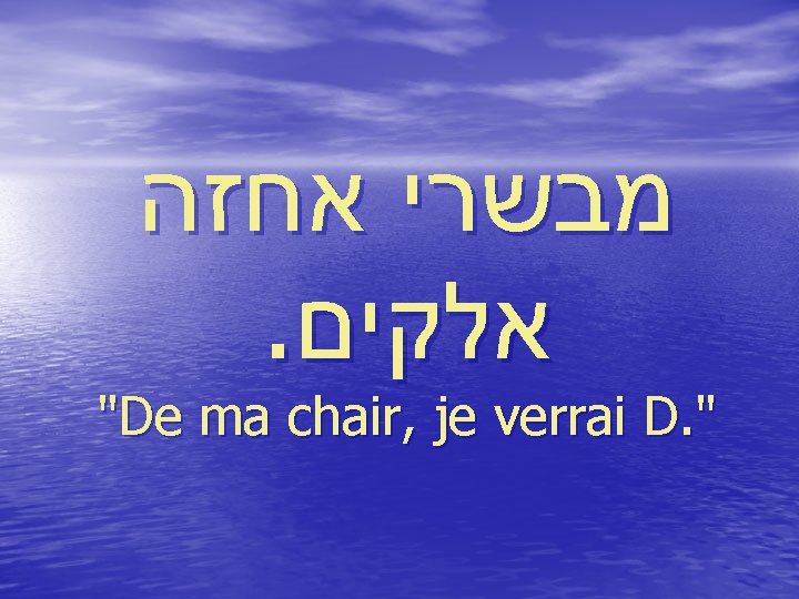 introduction 1. pas בראה mais מבשרי : pas « en voyant ma chair » mais « à partir de ma chair » , en examinant en détail ! 2. pas חוזה אני mais אחזה : pas « je vois » mais «je verrai » , après cet examen ! 3. אלוקים : ni le hasard, ni un homme, mais seulement lui, mon créateur !
