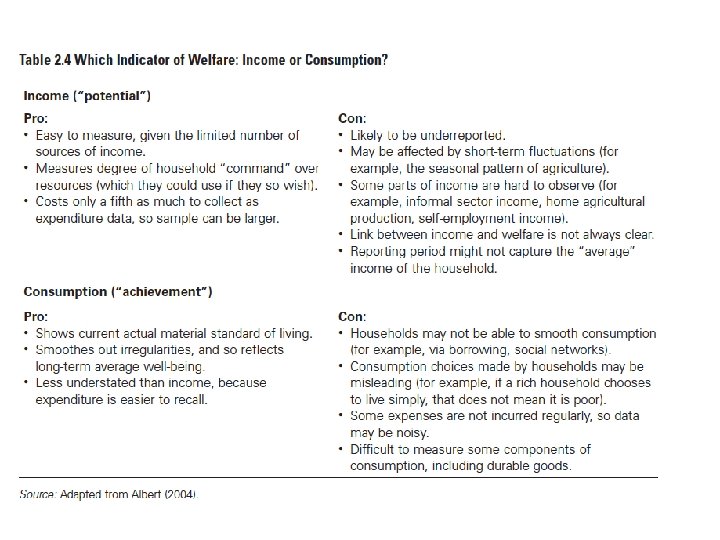 Consumption: problems A more practical case for using consumption, rather than income, is that households may be more able, or willing, to recall what they have spent rather than what they earned. • Households tend to underdeclare what they spend on luxuries or illicit items • Questions matter. The understatement of both income and consumption means that poverty rates are overstated. [1] reference: Lectures by Luigi Biggeri