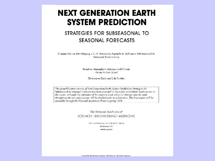 Summary • High need for improved S 2 S precip forecasting for water management • Scientifically challenging, but large potential payoff for water, agriculture, transportation, etc. sectors • Recent National Academy of Sciences report, new regional-scale observations of extreme precipitation show pathway forward