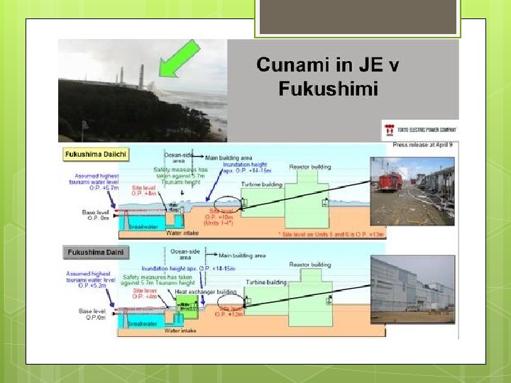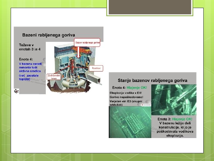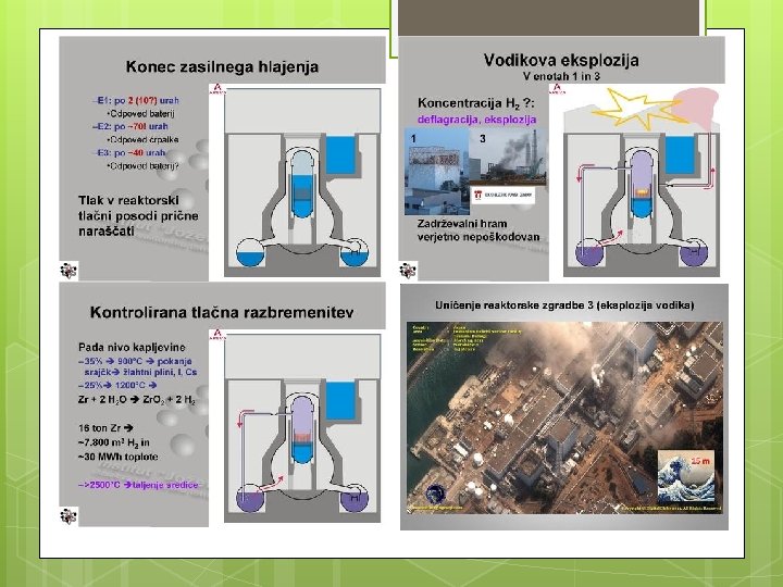 Nuklearna elektrarna Fukušima Daiči • 6 vrelnih reaktorjev s skupno močjo 4700 MW (NEK 700 MW) • 1. , 2. , 3. reaktor obratovali, 4. v remontu, 5. in 6. v zaustavitvi • Po cunamiju izgubili napajanje za hlajenje sredice in zadrževalnih bazenov.