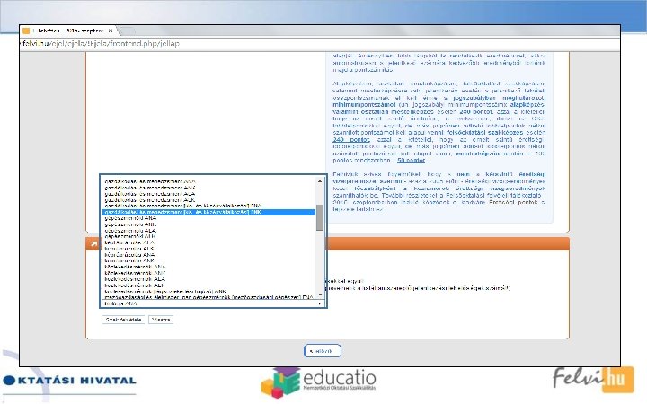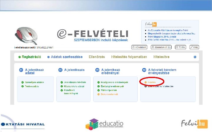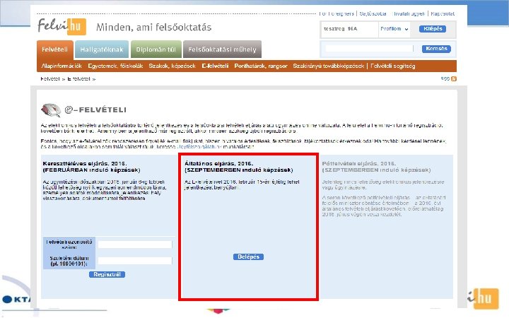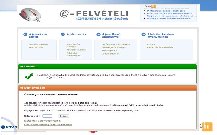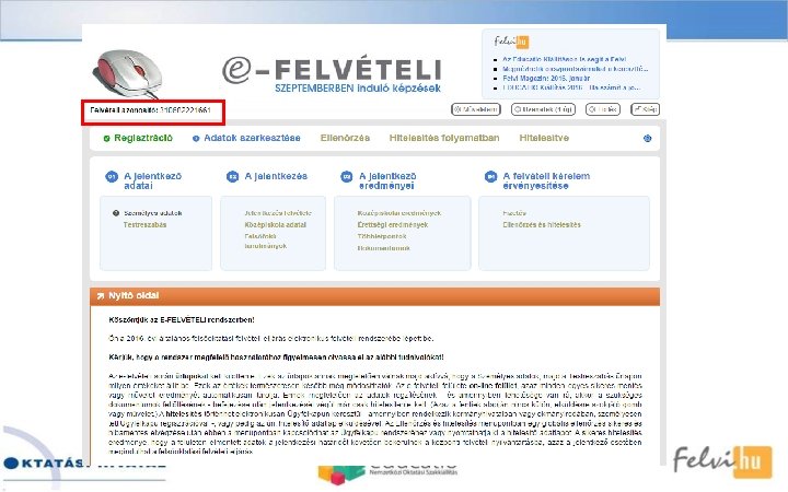 Előnyei, jellemzői üBármikor kezdhető, folytatható (határidőig)! üBármikor javítható, módosítható (határidőig)! üÉrvényességet kizáró adat (személyes vagy jelentkezési hely) hiányossága nem fordulhat elő! üCsak az aktuális meghirdetések választhatók! üA kommunikáció a felületen keresztül és e-mailben zajlik! üEgyszerűen használható (súgók, felugró ablakok, választéklisták, automatikus javítások)!