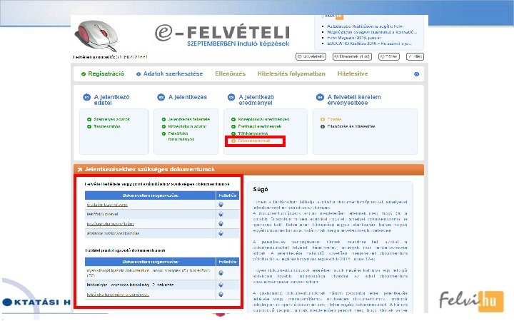 E-felvételi a jelentkezés után is! 2016. április végétől Ügyintézés Május személyes adatok módosítása jelentkezési sorrend egyszeri módosítása adatok megtekintése Június jelentkezés hely(ek) visszavonása dokumentumok pótlása 2016. július 12. Tájékozódás jelentkezői státuszlap (nyomtatható) dokumentumok feldolgozottsága Július Aug. kérelmek feldolgozottsága pontszámok megtekintése ponthatárok megtekintése besorolási döntés letöltése