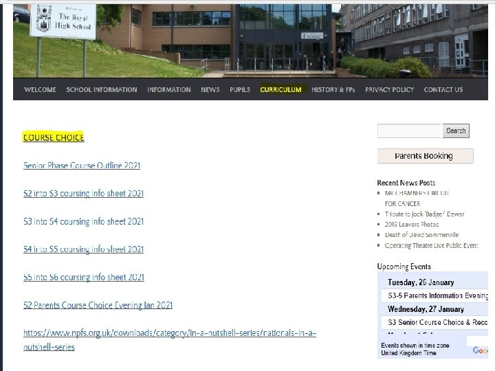 Jen Menzies: Depute Headteacher Pauline Walker: Headteacher Jen O’Neill: School Careers Adviser The Royal High School Calendar 2020/21 Session Wednesday 27 th January 2021 S 3 Tracking Report issued Friday 29 th January 2021 S 4/5/6 Tracking Report issued Monday 01 February 2021 S 4 Parents Evening By Friday 05 February 2021 S 4 Course Choice with Guidance Tuesday 16 February 2021 S 5 -6 Parents Evening By Thursday 18 February 2021 S 5 Course Choice with Guidance Wednesday 24 February 2021 S 3 Parents Evening By Friday 26 February 2021 S 3 Course Choice with Guidance