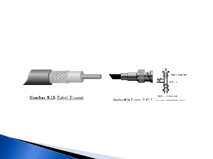 Kabel Koaksial adalah kabel yang memiliki satu konduktor copper ditengahnya. Jenis kabel ini biasanya digunakan untuk Topologi Bus. Ada dua jenis tipe kabel koaksial yaitu kabel koaksial thick dan kabel koaksial thin. � Kabel koaksial thin (RG-58) disebut juga dengan 10 Base 2 (thinnet) . dimana angka 2 menunjuk pada panjang maksimum untuk segment kabel tersebut adalah 200 meter, namun kenyataannya hanya samapai 185 meter. � Kabel koaksial thick (RG-8) disebut juga dengan 10 Base 5 (thicket), dengan spaseifikasi teknis : Spesifikasi Teknis dari kabel ini adalah : � Mampu menjangkau bentangan maksimum 500 meter. � Impedansi terminator 50 Ohm. � Membutuhkan Transceiver sebelum dihubungkan dengan komputer