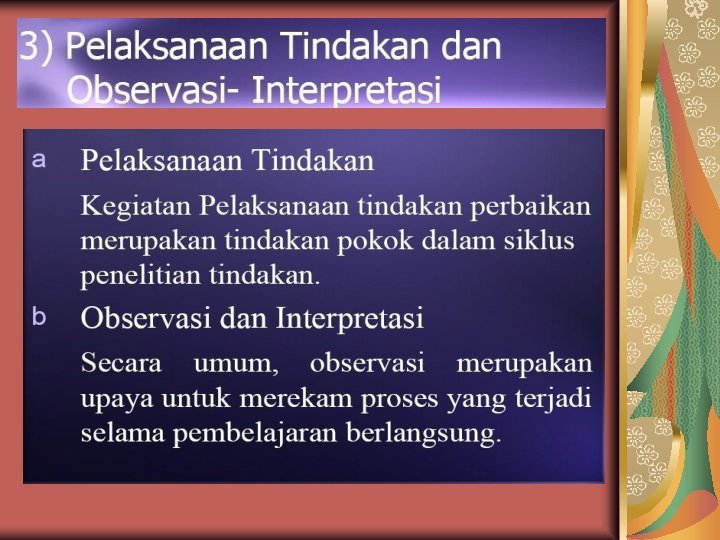 HASIL PENELITIAN Menguraikan pelaksanaan penelitian tindakan kelas, mulai perencanaan (bukan menyusun rencana), pelaksanaan, dan observasi (pengumpulan data). Menyajikan data. Data disajikan untuk setiap variabel, biasanya dalam bentuk tabel. Analisis data SIMPULAN DAN SARAN