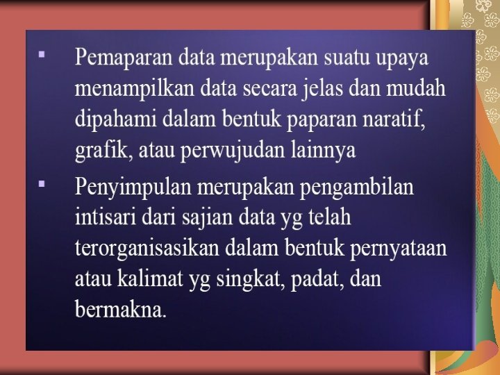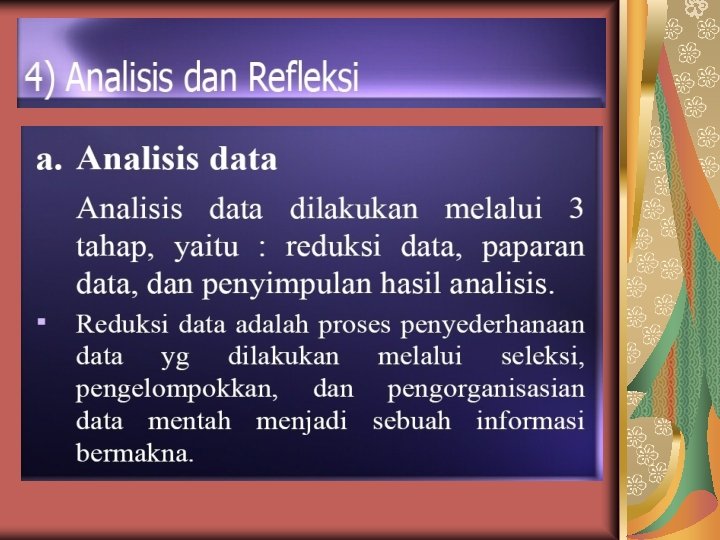 LANJUTAN Met Pengum data Data • Diorganisir • Disajikan • Dianalisis • • ANALISIS DATA Data variabel apa saja? Jenis data apa? Tujuan analisis data: mengolah data yang ada untuk menjawab masalah. Teknik analisis data yang digunakan mengacu pada masalah
