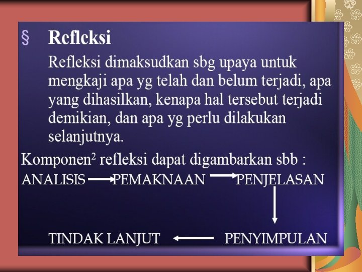 KOMPONEN UTAMA PTK • Menginginkan terjadinya perbaikan pembelajaran Syarat utama menjadi guru profesional • Didasarkan pada refleksi diri • Agar tujuan pembelajaran dpt tercapai secara optimal MENGAPA ? ?