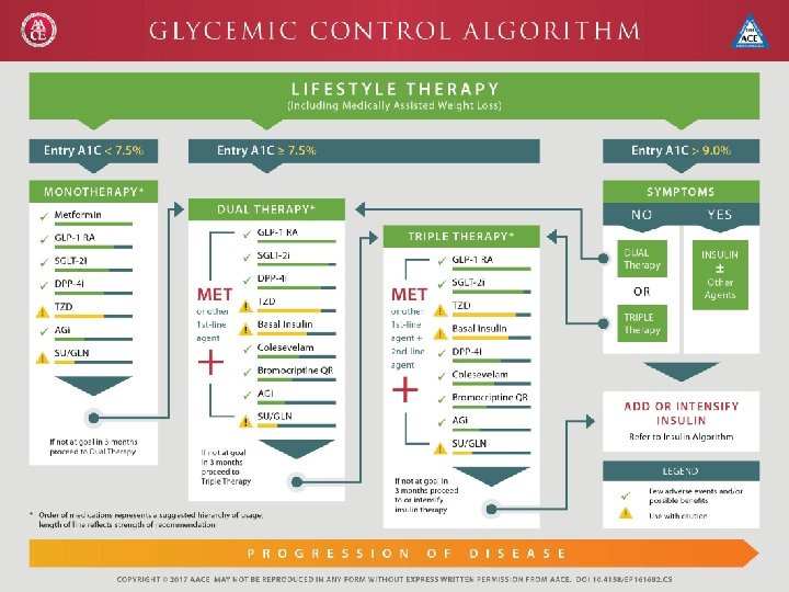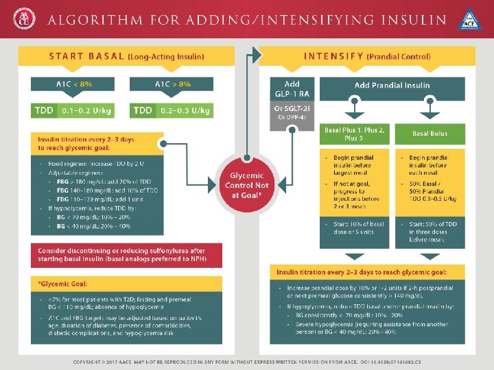 A 1 C Goals AACE A 1 C ≤ 6. 5 • For patients with low hypoglycemic risk and no concurrent serious illness A 1 C >6. 5 • For patients with hypoglycemic risk, concurrent illnesses, and significant CVD ADA A 1 C <7. 0% • Most non-pregnant adults A 1 C <8. 0% • History of severe hypoglycemia • Limited life expectancy • Advanced micro- or macrovascular complications • Extensive comorbid conditions, or long-standing diabetes where the general goal is difficult to attain despite active management A 1 C <6. 5% • Without significant hypoglycemia or other adverse effects • Short duration of diabetes • T 2 DM treated with lifestyle or metformin only • Long life expectancy • No significant CVD American Diabetes Association. Diabetes Care. 2017; 40(Suppl. 1): S 48–S 56. American Association of Clinical Endocrinologists. 2017. https: //www. aace. com/publications/algorithm.