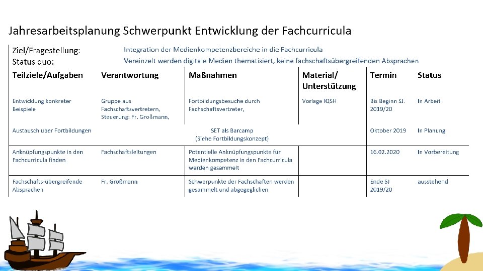 Überarbeitung Fachcurricula Ausstattungsplanung Fortbildungskonzept Raumkonzept Zeitkonzept Fächerkonzept
