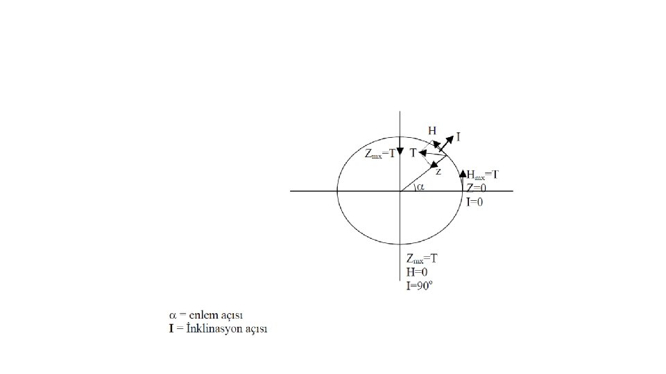 Manyetik Yöntem • 1) Yerin manyetik elemanları : Yerin manyetik alanını tanımlamaya en uygun olan ve yerin merkezinde bulunan bir manyetik dipolün ekseninin uzantılarının yeryüzünü kestiği noktalara “Jeomanyetik kutup” denir. Yer yuvarlağı üzerindeki manyetik alan kabaca, merkezine yerleştirilmiş ve dönme ekseni ile 11. 5 lik açı yapan bir dipolün alanına eşdeğer olarak düşünülebilir. Yeryuvarı üzerindeki herhangibir noktada manyetik alan şiddeti T bir vektördür ve yatay ile düşey bileşenleri vardır