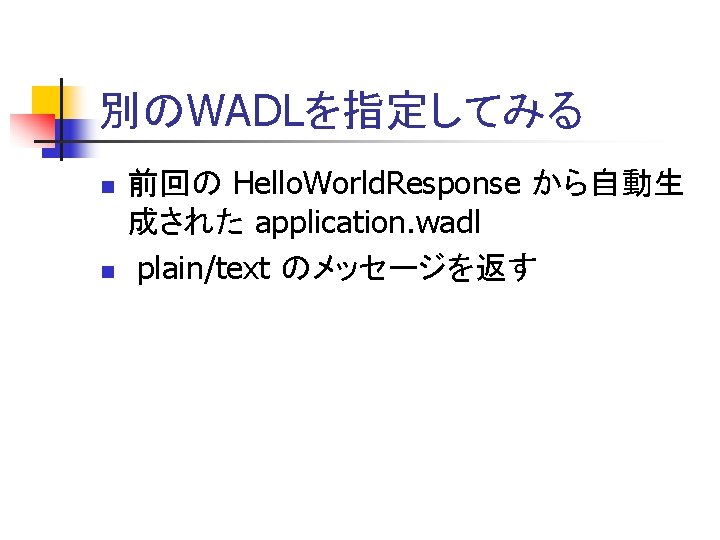 Helloworld の WADL(全体) <application xmlns="http: //research. sun. com/wadl/2006/10"> <resources base="http: //localhost: 9998/"> <resource path="/helloworld"> <method name="GET"> <response> <representation media. Type="text/plain"/> </response> </method> </resources> </application>