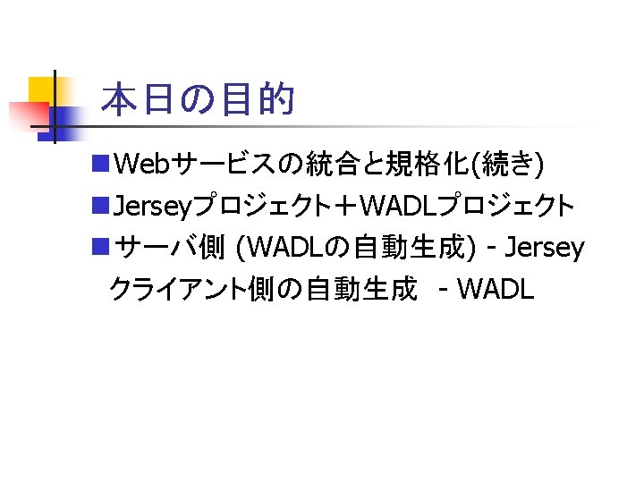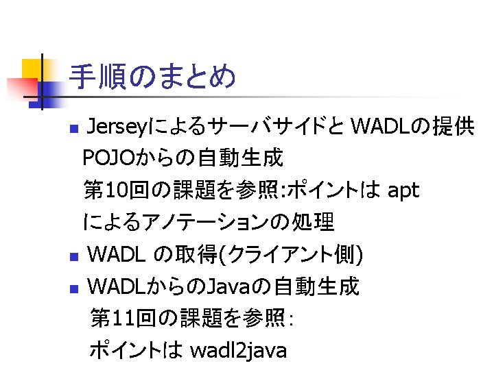 Jersey の自動処理 Hello. World. Service を記述するWADLが 自動生成 com/sun/ws/rest/wadl/resource の下に application. wadl 同じディレクトリに Wadl. Resouce のソースとバイトコード生成 =>application. wadlの情報を提供する
