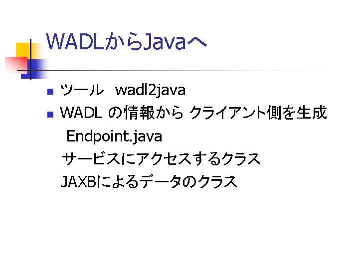 クライアントプログラム(2) Endpoint. Helloworld service = new Endpoint. Helloworld(); Data. Source source = service. get. As. Text. Plain(); Reader reader = new Input. Stream. Reader( source. get. Input. Stream() );