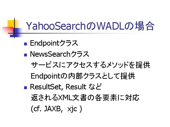 import java. util. List; import com. yahoo. search. *; public class Client { public static void main( String[] args ) { Yahoo. Searchのクライアントの例 Endpoint. News. Search search = new Endpoint. News. Search(); Result. Set set = search. get. As. Result. Set( "jaxws_restful_sample", args[0] ); // 第1引数はID情報、第2引数は検索ワード // URI などの情報は表に現れない!