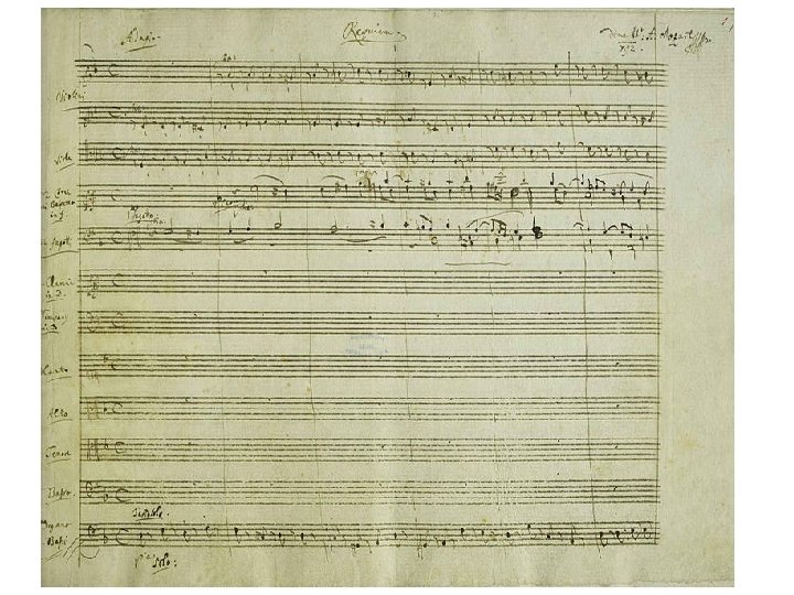 REQUIEM-------Comandat de către contele Walsegg von Stuppach Conceput în doisprezece părți • I. Introitus: Requiem aeternam, adagio, re minor (cor, solo de soprană, cor). Urmată nemijlocit de: • II. Kyrie, allegro, re minor (fugă) (cor) • III. Sequenz • 1. Dies irae, Allegro assai, re minor (cor) • 2. Tuba mirum, andante, si major (cvartet de soliști) • 3. Rex tremendae, sol minor (cor) • 4. Recordare, fa major (cvartet de soliști) • 5. Confutatis, andante, la (cor) • 6. Lacrimosa, re minor (cor) • IV. Offertorium • 7. Domine Jesu, andante con moto, sol minor (cor, soliști), fugă Quam olim Abrahae (cor) • 8. Hostias, Es (cor) cu repetarea fugii Quam olim Abrahae • 10. V. Sanctus, adagio, re major și fuga Osanna (Cor) • 11. VI. Benedictus, andante, si major (cvartet de soliști) și fuga Osanna (cor) • 12. VII. Agnus Dei, re minor (cor). Urmată nemijlocit de: • VIII. Communio: Lux aeterna, Adagio, re minor (Sopransolo, Chor) + Allegro, re minor (Fugă, Cor) 9. Andante