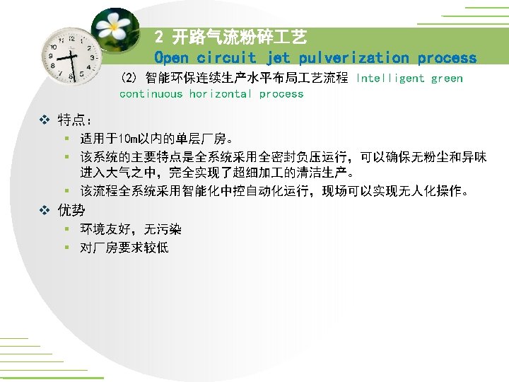 2 开路气流粉碎 艺 Open circuit jet pulverization process (2) 智能环保连续生产水平布局 艺流程 Intelligent green continuous horizontal process 国家精品课程网上资源的可用性研究/***