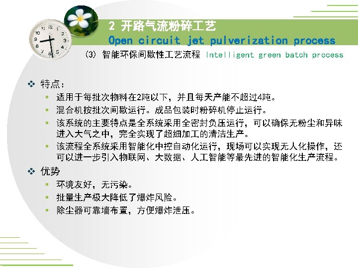 2 开路气流粉碎 艺 Open circuit jet pulverization process (3) 智能环保间隙性 艺流程 Intelligent green batch process 国家精品课程网上资源的可用性研究/***
