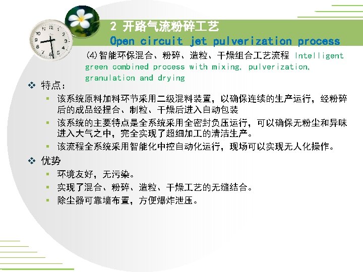 2 开路气流粉碎 艺 Open circuit jet pulverization process (4)智能环保混合、粉碎、造粒、干燥组合 艺流程 Intelligent green combined process with mixing, pulverization, granulation and drying 国家精品课程网上资源的可用性研究/***