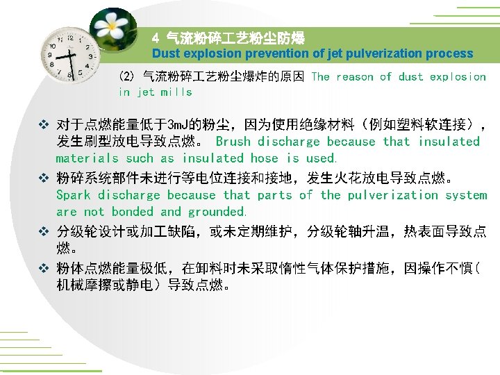 4 气流粉碎 艺粉尘防爆 Dust explosion prevention of jet pulverization process (1) 气流粉碎 艺在爆炸防护上的优势 The advantages of the jet pulverization in the aspect of explosion prevention v 气流粉碎机不依赖运动部件粉碎,因此一般不会出现机械火 花。如有异物进入也不会因此而产生热表面或火花。 Pulverization doesn’t depend on movement of part for jet mills. If there is ingress of foreign objects, neither heat surfaces nor sparks will be generated. v 气流粉碎系统易于密封,易于进行惰性气体保护 The jet pulverization system is easy to be sealed airtight, and easy to be protected by inter gases. 国家精品课程网上资源的可用性研究/***