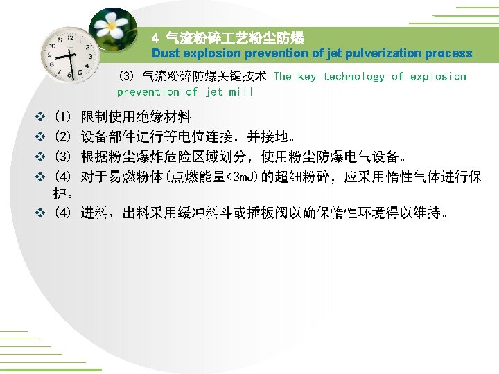 4 气流粉碎 艺粉尘防爆 Dust explosion prevention of jet pulverization process v (1) 气流粉碎 艺在爆炸防护上的优势 The advantages of the jet pulverization in the aspect of explosion prevention v (2) 气流粉碎 艺粉尘爆炸及其原因 Dust explosion of the jet pulverization processes and the reasons v (3) 气流粉碎防爆关键技术 The key technologies of explosion prevention of the jet pulverization processes 国家精品课程网上资源的可用性研究/***
