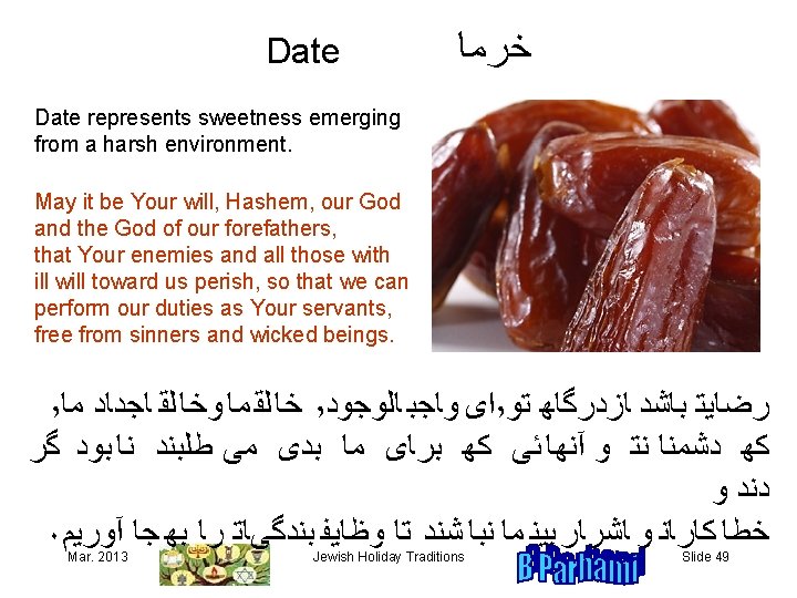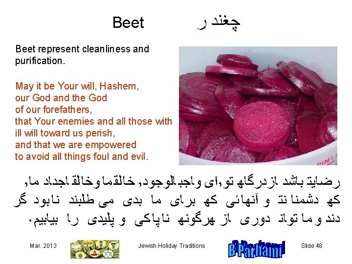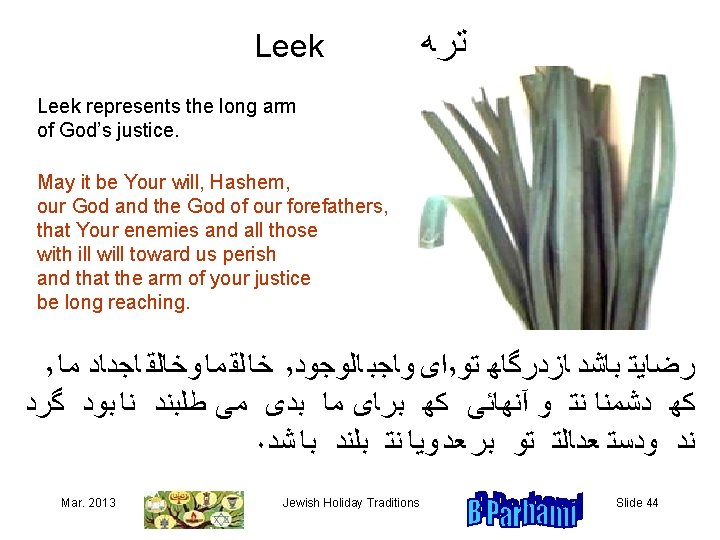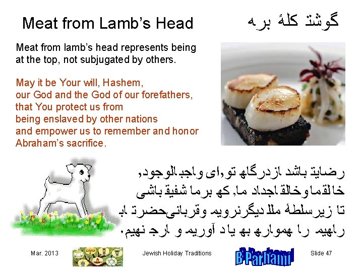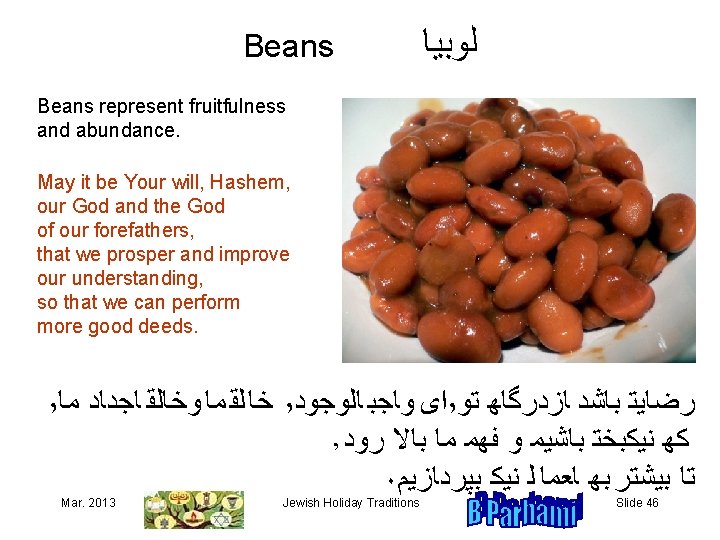 Pumpkin or Zucchini ﻛﺪﻮ We pray that our hardships would melt away, as pumpkin or zucchini melts in our mouth. May it be Your will, Hashem, our God and the God of our forefathers, that You protect us from all hardships and take account of our good deeds. ٬ ﺍﻯﻬﻮﺎﺠﺒ ﺎﻠﻮﺠﻮﺪ ٬ ﺭﻀﺎﻴﺘﻬﺒﺎﺸﺪﻬﺎﺰﺪﺮﮔﺎﻬﻬﺘﻮ ٬ ﺧﺎ ﻠﻘ ﻤﺎﻬ ﻮﻬﺨﺎ ﻠﻘﻬﻬﺎﺠﺪﺎﺪﻬﻬﻤﺎﻪ ﻛﻬﻬﺴﺨﺘﻰﻬﺎﻬﺮﺎﻬﺎﺰﻬﻤﺎﻬﻬﺪﻮﺮﻬﻜﻨﻰ ۰ ﻭﻬﻜﺮﺪﺎﺮﻨﻴﻜﻬﻤﺎﻬﻬﺪﺮﻬﺪﺮﮔﺎﻬﺘﻬﺨﻮﺎﻨﺪﻬﻬﻬﺸﻮﺪ ﻬ ﻬ Mar. 2013 Jewish Holiday Traditions ﻬ ﻬ ﻬ Slide 45