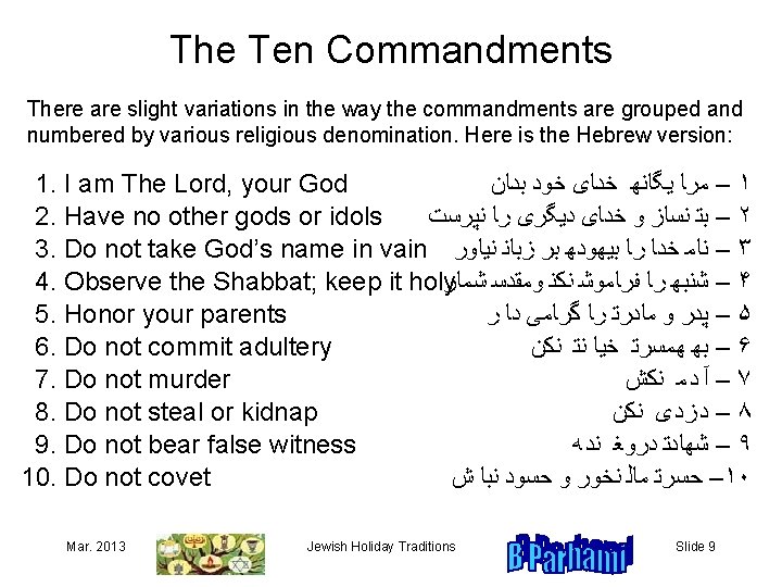 About This Presentation This presentation has been prepared to document the religious and social traditions of a Persian Jewish family. It is based on the non-orthodox religious practices of a modern Jewish family rooted in Iran’s Kurdistan province. The material contained herein can be used freely for personal and educational purposes. Unauthorized uses, including distribution for profit are prohibited. © B. Parhami Edition Released Revised First Sep. 2008 Apr. 2009 Sep. 2010 Mar. 2013 Jewish Holiday Traditions Slide 2