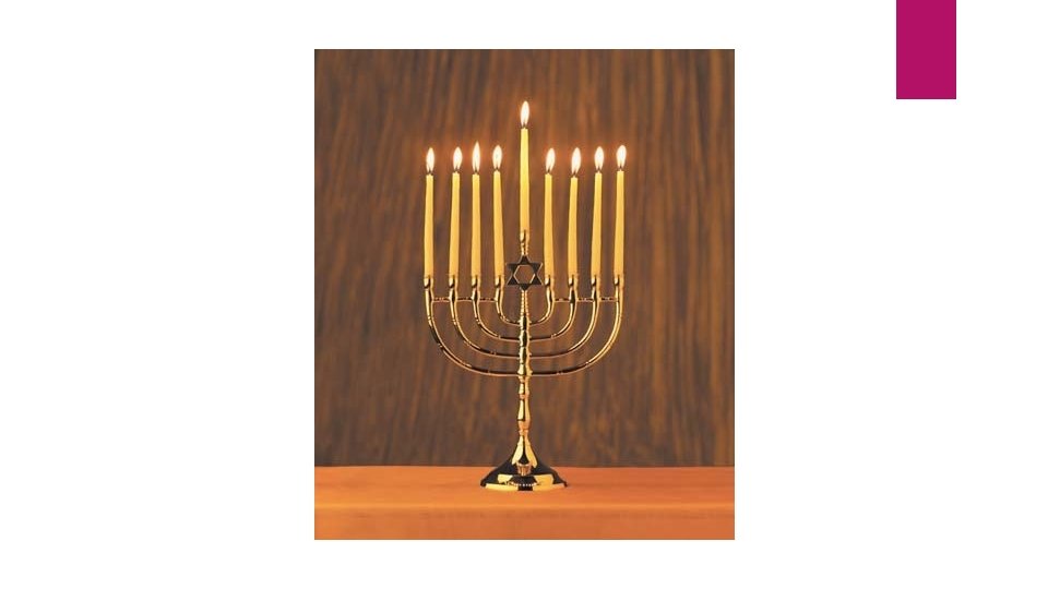 Menorah Significance 7 branched candelabra Recognition of the miracle of Maccabees when the oil lasted for 7 days When/Where it is Used in the synagogue to represent Israel as “the light unto nations” Central symbol of Hanukkah