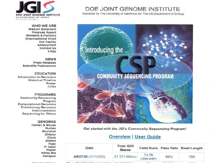 Overview The Community Sequencing Program (CSP) To provide the scientific community through a peer reviewed process access to high throughput sequencing at the JGI.