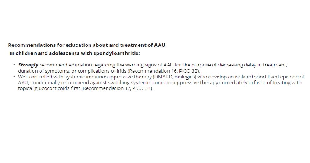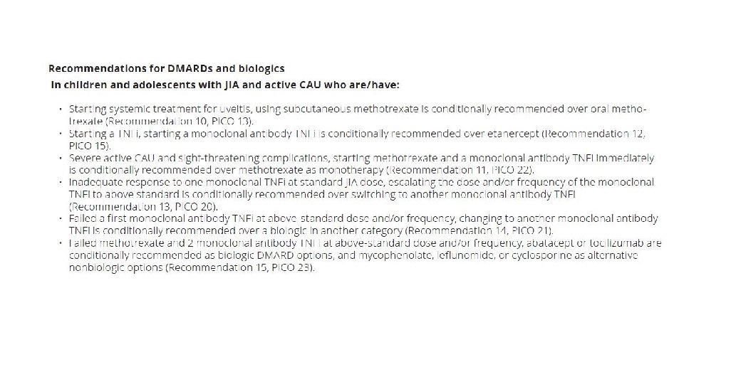 JIA- uveitis • Treatment: • systemic IMT should be considered for chronic active uveitis. • weekly low-dose MTX is effective and well tolerated. • recent studies support the use of Adalimumab and biologic agents in addition to MTX for severe disease. Health Technol Assess. 2019 Apr; 23(15): 1 -140. doi: 10. 3310/hta 23150. Adalimumab in combination with methotrexate for refractory uveitis associated with juvenile idiopathic arthritis: a RCT. Ramanan AV et al.
