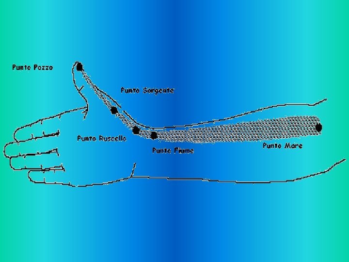 • Punto POZZO: in questi punti il meridiano è più superficiale, sottile e il Qi cambia polarità da yin a yang e viceversa. • Qui il Qi è di modesta entità e nel suo stato più instabile, di facile movimento, per cui può essere facilmente influenzata e modificata.