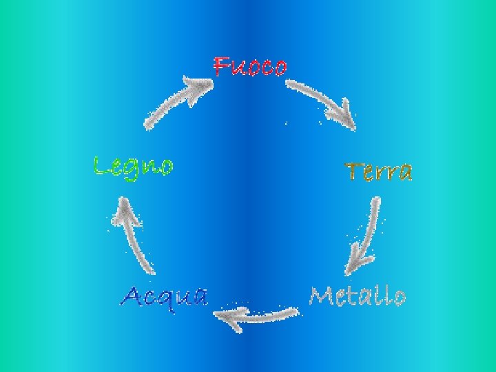 CORRISPONDENZE CON I 5 ELEMENTI • Nel Ling Shu gli Shu antichi sono paragonati allo scorrere di un fiume dalla sorgente al mare. Nel Nan Jing viene stabilita una correlazione fra i cinque punti Shu antichi e i cinque Movimenti secondo la sequenza di generazione