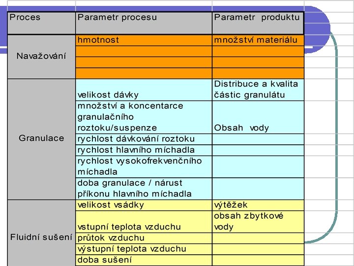 Parametry procesu: l doba granulace, výkon míchadla při granulaci, použité síto, otáčky při homogenizaci, doba homogenizace, l rychlost nástřiku potahovací suspenze, l rozmezí rychlosti tabletování nebo kapslování, l úplnost a správnost balení při adjustaci