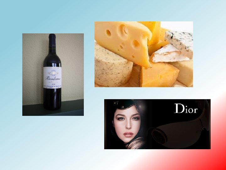 Když se řekne Francie Země galského kohouta Eiffelova věž Vítězný oblouk, Katedrála Notre Dame Sorbona – univerzita v Paříži Vylodění v Normandii – otevření 2. fronty za 2. světové války • Víno , šampaňské, koňak • sýry • Dior – kosmetika, móda, TGV • • •