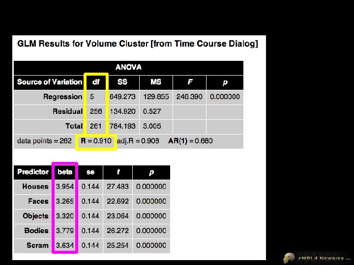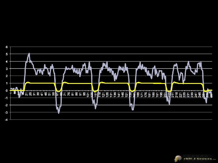 Brain Voyager’s Output Look up t = 33. 2 with 260 df p<. 000001 se is an estimate of noise for our beta Remember our 1 df (height of predictor) This is it – our β t = signal/noise = β/se = 3. 591/0. 108 = 33. 2