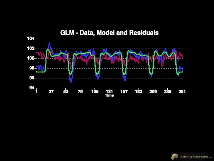 Brain Voyager’s Output Our model had only 1 df Remaining df is noise (residuals) In a model for a single subject, total df = volumes - 1 Our model accounts for variance of 635 Total variance = 784 Our model accounts for R 2 = 0. 92 = 81% of the variance 635/784 = 81%