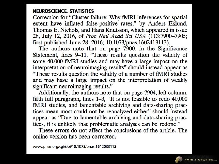 What a Clusterf… ailure! 2016 • resting-state data from Functional Connectomes Project • applied stats to test for task-based “activation” using SPM, FSL and AFNI software packages • since there was no real task-based activation, false positives for cluster correction should be 5% • tested block designs and event-related designs with varying degrees of spatial smoothing (4 -, 6 -, 8 -, and 10 -mm FWHM)