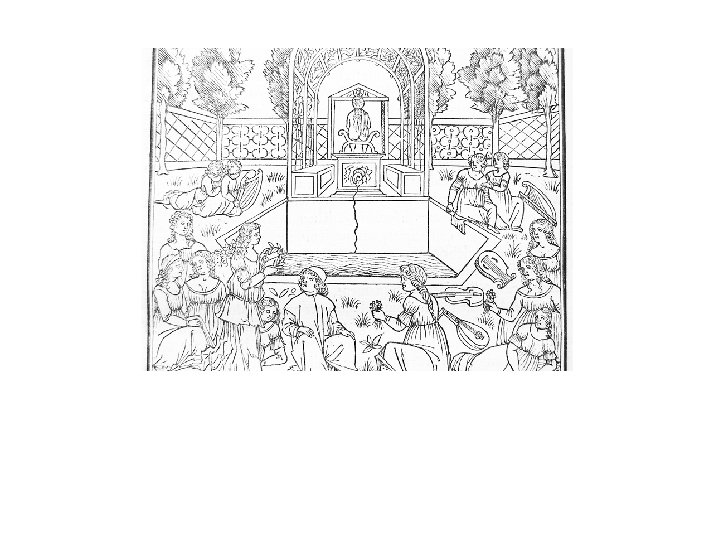 Reinterpretacija Romana o ruži i dvorski redovi • Jean Molinet krajem 15. stoljeća pokušao romanu dati moralni karakter; pa je po njemu zdenac na početku romana simbol krštenja, slavuj koji poziva na ljubav glas propovjednika, a ruža Isus. • U petnaestom stoljeću zbog obrane ideala viteške ljubavi i u ime obrane žena Boucicaut je osnovao Red bijele dame. Burgundski vojvoda Filip Smjeli osim što je osnovao red ljubavi zajedno s Lujem Burbonskim zamolio je kralja da uredi Dom ljubavi zbog razonode uslijed epidemije kuge koja je vladala u Parizu. Taj se dvor osnovao na vrlinama poniznosti i vjernosti, te je imao strogo propisane funkcije i ceremonije. Članovi su bili pokraj prinčeva i prelata, građani i niži svećenici. Članovima je udijeljen i zadatak da obrađuju refren u svim ustaljenim oblicima stiha: baladama, šansonama, i dr. Vodile su se i debate u obliku ljubavnih procesa da bi bila zastupana različita mišljenja. Dame će dijeliti nagrade, a zabranjeno je vrijeđanje žena.
