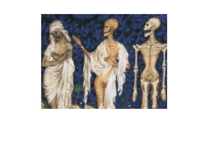 • • To je razlog i duboke brižnosti postupanja s leševima. Postojao je običaj da se lice uglednih pokojnika premaže bojom da raspadanje ne bude vidljivo prije pogreba. Iz svega toga progovara materijalistički duh koji se ne može osloboditi misli o tijelu. Bilo je uobičajeno da se leševi uglednih ljudi koji su umrli daleko od zavičaja, rasijeku i kuhaju sve dok se meso ne odijeli od kostiju. Kosti su zatim bile očišćene i u kovčegu poslane na svečanu sahranu a unutrašnji organi su pokopani na mjestu smrti. Taj je običaj bio vrlo proširen u 12. i 13. st. a primjenjivao se kako na biskupe tako i na čitav niz kraljeva. Papa Bonifacije VIII je 1299. ovaj običaj strogo zabranio kao znak odvratne surovosti koji su neki vjernici iz neukosti vršili pokoravajući se strašnom običaju. Englezi i Francuzi taj su običaj poštovali i u 15. st. Dogodilo se to i s lešom Henrika V. Lik same smrti bi je poznat stoljećima u više oblika: kao apokaliptični jahač koji preskakuje gomilu ljudi koji leže na zemlji, kao furija sa šišmiševim krilima koja se spušta sa visine, kao kostur sa strelicom i lukom, katkad na kolima koje vuku volovi, ponekad jašući na volu ili kravi. U 14. st. pojavljuje se riječ macabre. La danse macabre možemo označiti kao svekoliku viziju smrti svekolikog srednjeg vijeka. Na makabralni prikaz smrti nailazimo na suvremenijim francuskim seoskim grobljima gdje se čuje njegov odjek u stihovima i figurama. U tu je predodžbu smrti prodro nov, fantastičan element jeze. Sveopća religiozna misao pretvorila je odmah tu predodžbu u moral svela je na memento mori, ali se rado služila jezovitom sugestijom koji je u sebi nosio sablasni karakter te predodžbe, čemu je postala svrha plašenje i opominjanje. Parabola o Tri mrtva i tri živa prethodila je mrtvačkom plesu, a u franc. knj. pojavila se u 13. st. Trojica mladih plemića susreću trojicu mrtvaca koji ih podsjećaju na svoju nekadašnju zemaljsku veličinu i na skorašnji kraj koji prijeti živima. Potresni likovi na Campo santo u Pisi najstariji su prikaz te umjetnosti. Skulpture na groblju Innocnets u Parizu na kojemu je prema nalogu vojvode Berryja 1408. prikazan takav prizor propale su. Drvorez i minijatura u 15. st. su prikazivali ove prizore, a prošireni su i na zidno slikarstvo. Prikaz trojice mrtvih i trojice živih predstavlja kariku između odvratne slike raspadanja i u mrtvačkom plesu oblikovane misli da su pred smrću svi jednaki. Mrtvački se ples prikazivao i na pozornici. Burgunski ga je vojvoda dao 1449. dao izvesti u svom konaku
