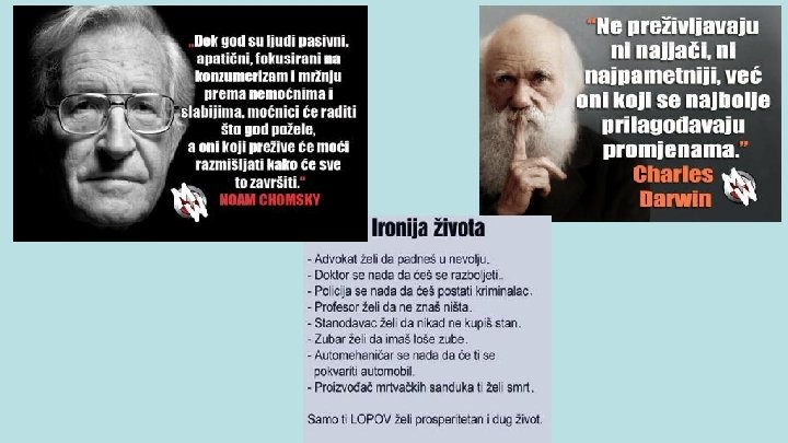 Johan Volfgang fon Gete: -“Podcenjivati neprijatelja pre smrti je glupost, posle pobede podlost. ” -“Zlato kupuje glas gomile, ali ti neće pribaviti ni jedno jedino srce. ” -“Pametnom čoveku je skoro sve smešno, mudrom skoro ništa. ” -“Sretan je i velik zaista samo onaj koji ne mora ni vladati ni pokoravati se da bi mogao nešto biti” Napoleon Bonaparta: 1) 2) 3) 4) “ Religija je ono što sprečava siromašne da pobiju bogate “ “ Nemoguće je reč koja postoji samo u rečniku budala “ “ Najsigurniji način da budeš siromašan je ostati pošten “ “ Sve religije stvorili su ljudi “ Upalite zvučnike