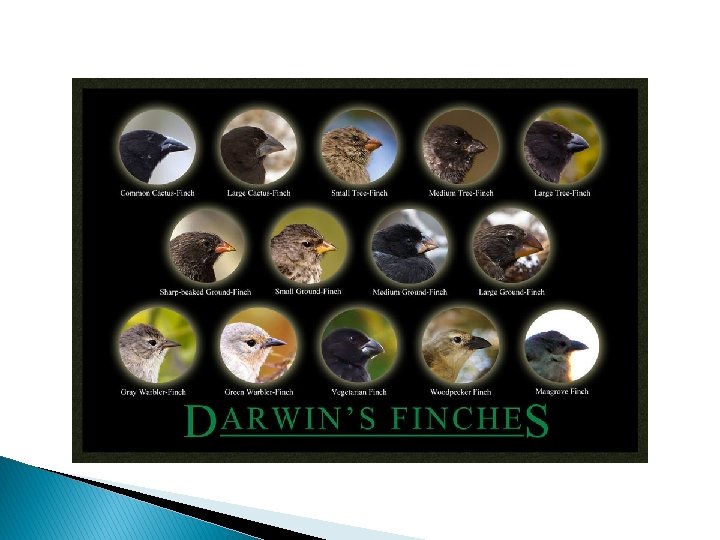 Galapagos finches showing different beak shapes � Whilst studying wildlife on the Galapagos Islands [Darwin] noticed that the Galapagos finches showed wide variations - eg in beak shape and size - from island to island. Darwin deduced that these differences made the finches better adapted to take advantage of the food in their particular local environment thin, sharp beaks prevailing where the birds' main food was insects and grubs, and large claw-shaped beaks where their diet was buds, fruit and nuts. In each locality the finch population had somehow developed beaks which were suitable for that particular environment.