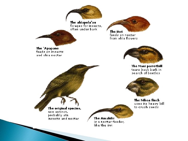 natural selection can create new species The Hawaiian honeycreepers all evolved from a single ancestor, which arrived on the islands long ago. With no other birds for competition, the honeycreepers began to feed on different foods. Over many generations, their bills changed to cope with their new diets.