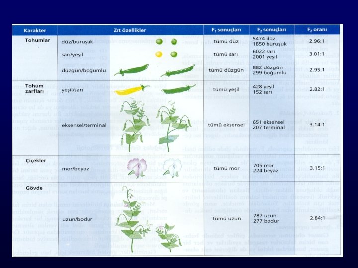 • Mendel, zıt özelliklerde saf ırkları elde ettikten sonra onları çaprazladı. • Ör: sarıları yeşillerle, düzleri pürüzlülerle çaprazladı. Elde ettiği bütün tohumlar sarı ve düzdü. Üstelik ana yada baba sarı renkte olsun bu özellik değişmiyordu. Sonuçta, bu zıt özelliklerden bir tanesinin eşeye bağlı olmadan diğerine baskın (dominant) olduğunu anlamıştır.