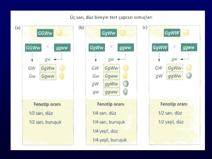 Test Çaprazı: İki karekterli İki baskın özelliği ifade eden fakat genotipleri bilinmeyen bireylere de uygulanabilir. Ör: F 2 neslindeki sarı düz fenotipin ifadesi, GGWW, GGWw, Gg. WW, Gg. Ww genotipleri ile sonuçlanabilir. Eğer F 2 sarı-düz bir bitki, yeşil-buruşuk homozigot çekinik (ggww) bir bitki ile çaprazlanırsa, yavruların incelenmesi, sarı düz bitkinin esas genotipini belirtecektir.