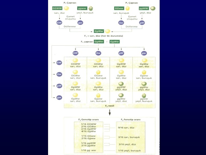 • Mendel, düz tohumlu sarı bezelye ile pürüzlü yeşil bezelyeleri çaprazladı. F 1’in hepsi düz sarı renkliydi. • Bu bitkileri kendi aralarında çaprazladığında F 2’de 4 çeşit kombinasyonun ortaya çıktığını gördü. Onları saydığında: -315 tane düz-sarı -108 tane düz-yeşil -101 tane pürüzlü-sarı -32 tane pürüzlü yeşil tohum elde edildiğini görmüştür. (3/1 oranı)(416 sarı/140 yeşil, 423 düz/133 pürüzlü)