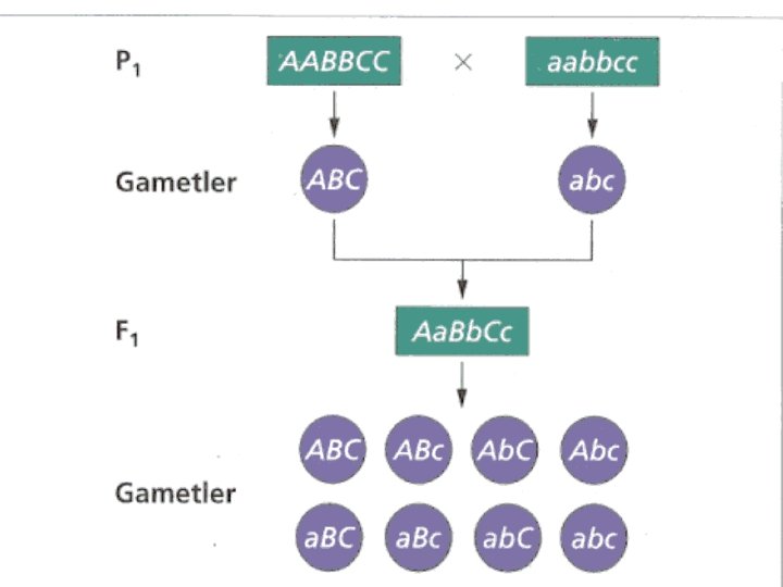 A/a, B/b, ve C/c (birbirine zıt özellik gösteren gen çiftleri) AABBCC x aabbcc F 1(3 gen çiftinin üçü içinde heterozigotdur) Eger genotip Aa. Bb. Cc ise baskın A, B, C özelliklerin fenotipleri görülür. F 1 bireyleri ebeveyn olduklarında, her bir eşit frekansta 8 farklı gamet oluşur. Bu noktada 64 ayrı kutulu bir Punnett karesi oluşturulur.