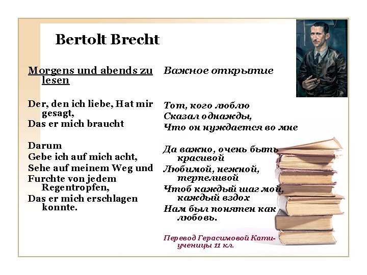 Bertolt Brecht Lied einer Liebenden Песня влюбленного Wenn du mich lustig machst Dann denk ich manchmal: Jetzt konnte ich sterben Dann hub ich gluklich Bis an mein End. Wenn du dann alt bist Und du an mich denkst Seh ich wie heut aus Und hast ein Liebchen Das ist noch jung. Когда я знаю, что любима Задумываюсь часто я: А буду ли такой всегда? Хочу я встретить старость С тобою друг родной. Ведь это мне поможет Остаться вечно молодой! Перевод Фадеевой Даши -ученицы 11 кл.