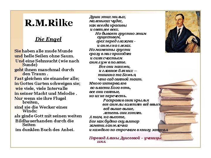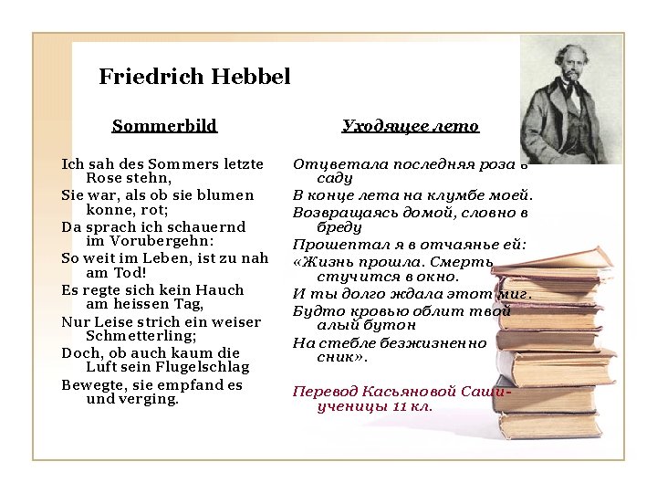 Johan Wolfgang von Goethe Woher sind wir geboren? Aus Lieb. Wie waren wir verloren? Ohn Lieb. Was hilft uns uberwinden? Die Lieb. Kann man auch Liebe fiden? Durch Lieb. Was lasst uns lange weinen? Die Lieb. Was soll uns stets vereinen ? Die Lieb. Любовь рождает нас на свет. Без любви нам жизни нет. С ней все преграды мы пройдём. Из любви любовь найдём Она нас плакать заставляет Любовь нас всех объединяет. Перевод Марины. Бондаренкоученицы 11 кл.