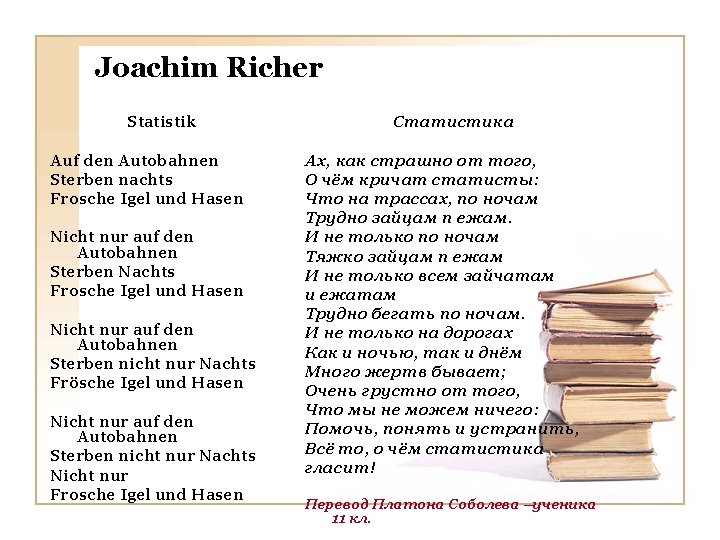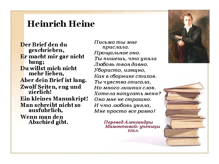 Johan Wolfgang von Goethe Woher sind wir geboren? Aus Lieb. Wie waren wir verloren? Ohn Lieb. Was hilft uns uberwinden? Die Lieb. Kann man auch Liebe fiden? Durch Lieb. Was lasst uns lange weinen? Die Lieb. Was soll uns stets vereinen ? Die Lieb. Любовь рождает нас на свет. Без любви нам жизни нет. С ней все преграды мы пройдём. Из любви любовь найдём Она нас плакать заставляет Любовь нас всех объединяет. Перевод Марины. Бондаренкоученицы 11 кл.