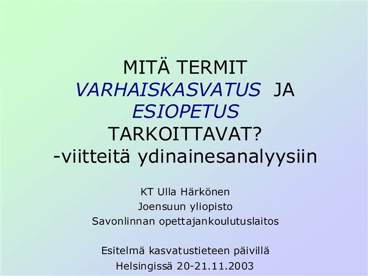 Johdanto Tämä on nettiversio kasvatustieteen päivillä 20 -21. 11. 2003 pidetystä powerpoint esitelmästäni Mitä termit varhaiskasvatus ja esiopetus tarkoittavat? (Härkönen 2003 b). Tähän nettiversioon on lisätty suullista puhetta vastaavia dioja, joten esityskin on pidentynyt. Esitelmä perustuu laajaan tutkimukseeni (Härkönen 2003 a), jossa analysoitiin kolmenkymmenen vuoden aikana Suomessa julkaistujen varhaiskasvatuksen ja esiopetuksen keskeisten oppikirjojen ja kolmen artikkelin sisältämiä varhaiskasvatuksen ja esiopetuksen määritelmiä. Analysoidut teokset on mainittu tutkimuksen lähdeluettelossa (Härkönen 2003 a, 247 -260). Mainittujen teosten tarkat kontekstuaaliset tiedot ovat tutkimuksen liitteessä 1 (emt. , 261 -262) sekä mallintamisen tulokset tutkimuksen liitteessä 2 (emt. , 263 -267). Tässä esityksessä mainittavien muutamien muiden henkilöiden teosten lähdetiedot löytyvät mainitun teoksen lähdeluettelosta. Yksi kuvio (kuvio 21) viittaa tekijän tutkimukseen Esiopetus ja esiopetussuunnitelma varhaiskasvatuksen viitekehyksessä (Härkönen 2002). Lähteet diassa 43.