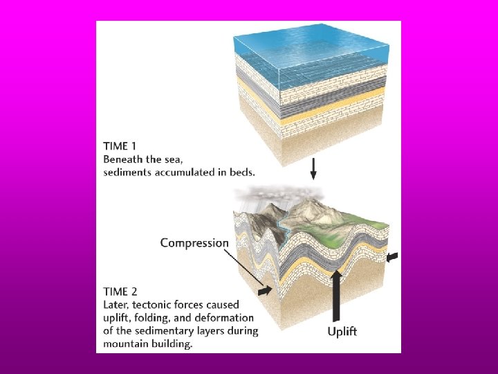 Principle of Original Horizontality sediments deposited innearly flat layers. Crossbedded layers are contained within overall flat beds. If layers are faulted (broken) or folded it means that they were deformed AFTER sediments were deposited.